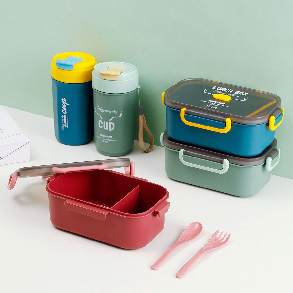 長方單層分格密封飯盒(1000ml)+圓形/八角隨行杯(500ml)
