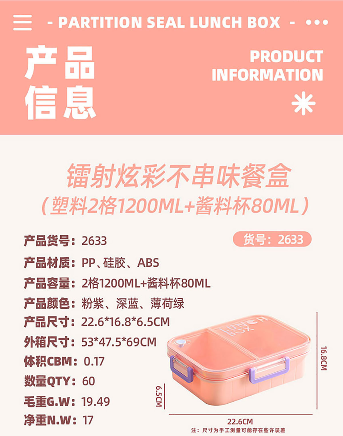 Size: AQX-2633:226*168*65mm/塑料2格1200ml+醬料杯80ml